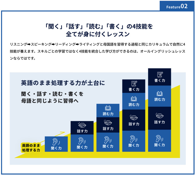 まで幅広く対応し、実践的なコミュニケーション力と自己表現力の習得を重視しています。